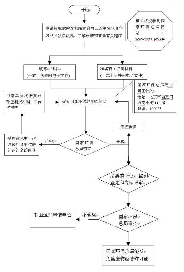 国家环保总局自受理申请之日起20个工作日内,对申请单位提交的证明材料进行审查,并对申请单位的经营设施进行现场核查。符合条件的,颁发危险废物经营许可证,并予以公告;不符合条件的,书面通知申请单位并说明理由。